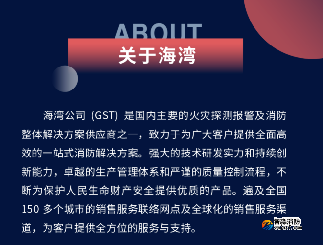 海灣公司(GST)是國內(nèi)主要的火災(zāi)探測報(bào)警及消防整體解決方案供應(yīng)商之一,致力于為廣大客戶提供全面高效的一站式消防解決方案。強(qiáng)大的技術(shù)研發(fā)實(shí)力和持續(xù)創(chuàng)新能力,卓越的生產(chǎn)管理體系和嚴(yán)謹(jǐn)?shù)馁|(zhì)量控制流程,不斷為保護(hù)人民生命財(cái)產(chǎn)安全提供優(yōu)質(zhì)的產(chǎn)品。遍及全國150 多個城市的銷售服務(wù)聯(lián)絡(luò)網(wǎng)點(diǎn)及全球化的銷售服務(wù)渠道,為客戶提供全方位的服務(wù)與支持。