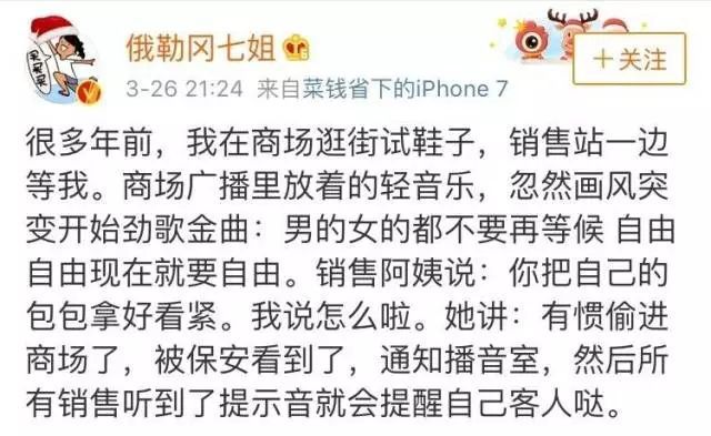 帖子說(shuō)的是,微博網(wǎng)友發(fā)帖稱(chēng),逛商場(chǎng)時(shí),如果商場(chǎng)的背景音樂(lè)畫(huà)風(fēng)突變,這有可能是商場(chǎng)發(fā)現(xiàn)有小偷“來(lái)訪”的警告!