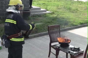 首先,消防員將食用油倒入鍋內(nèi)進(jìn)行加熱,充分加熱后點(diǎn)燃。