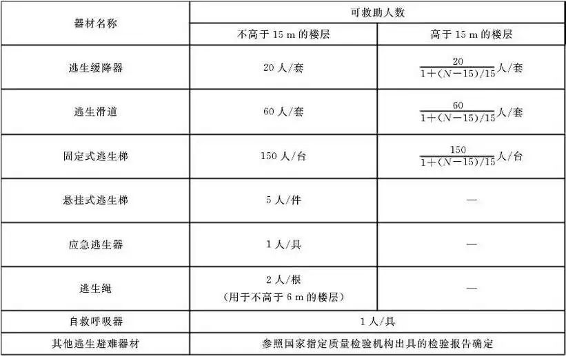 (1)逃生滑道、固定式逃生梯應配備在不高于60m的樓層內;逃生緩降器應配備在不高于30m的樓層內;懸掛式逃生梯、應急逃生器應配備在不高于15m的樓層內;逃生繩應配備在不高于6m的樓層內。地上建筑可配備過濾式自救呼吸器或化學氧自救呼吸器,高于30m的樓層內應配備防護時間不少于20min的自救呼吸器。地下建筑應配備化學氧自救呼吸器。逃生避難器材配備樓層(高度)見下表。