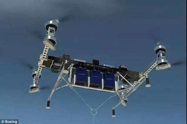 這架無人機(jī)可以承載兩頭小象的重量。這艘飛機(jī)重達(dá)339公斤(747磅),但還能攜帶226公斤(500磅)的貨物。波音公司表示,它可能會(huì)利用無人機(jī)在未來轉(zhuǎn)移重型貨物。這個(gè)身形矯健的無人機(jī)長4.6米(15英尺),寬5.5米(18英尺),高1.2米(4英尺)。從圖中可以看出,它有8個(gè)跟直升機(jī)一樣的旋翼,可以垂直起降。它是由電力推進(jìn)系統(tǒng)驅(qū)動(dòng)的。需要運(yùn)輸?shù)呢浳铮梢杂秒娎|連接到無人機(jī)上。
