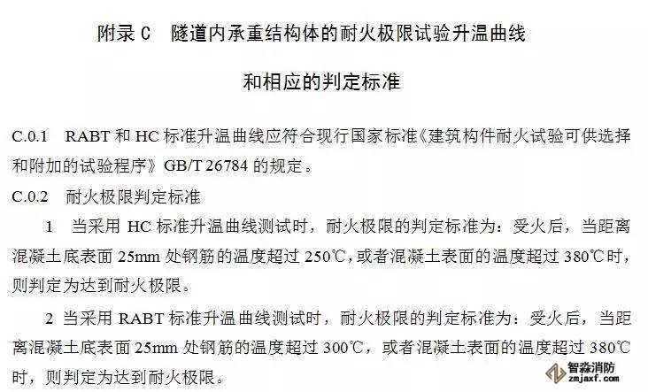 對(duì)于一、二類隧道,火災(zāi)升溫曲線應(yīng)采用本規(guī)范附錄C第C.0.1條規(guī)定的RABT標(biāo)準(zhǔn)升溫曲線,耐火極限分別不應(yīng)低于2.00h 和1.50h;