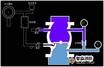 由供水設(shè)備(如穩(wěn)壓泵、高位水箱)供水,使系統(tǒng)充滿設(shè)計(jì)要求的壓力水,濕式報(bào)警閥閥瓣因自身重力而關(guān)閉。本系統(tǒng)在此狀態(tài)下,允許供水系統(tǒng)有波動(dòng),但不至于誤報(bào)。
