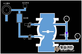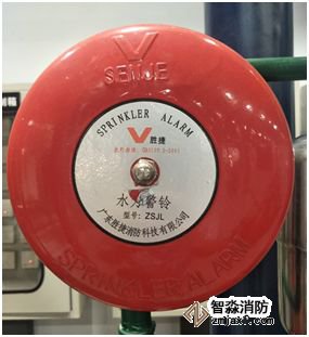 而發(fā)出聲光警報(bào)顯示火災(zāi)區(qū)域。同時(shí)由于濕式報(bào)警閥的開啟,使一部分水流入報(bào)警管路,通過延時(shí)器延時(shí)后水力警鈴發(fā)出報(bào)警鈴聲,同時(shí)壓力開關(guān)動(dòng)作向火災(zāi)報(bào)警控制器發(fā)出反饋信號(hào),火災(zāi)報(bào)警控制器通過邏輯關(guān)系啟動(dòng)噴淋泵。