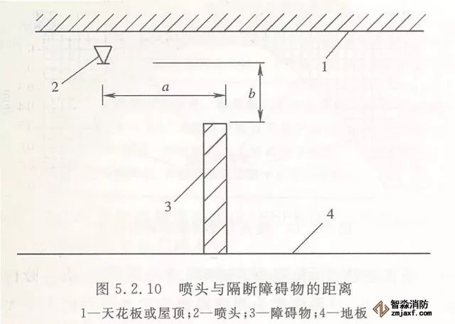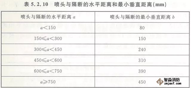 5.2.10 當(dāng)噴頭安裝在不到頂?shù)母魯喔浇鼤r(shí),噴頭與隔斷的水平距離和最小垂直距離應(yīng)符合表5.2.10的規(guī)定(見圖5.2.10)。
