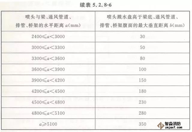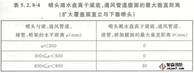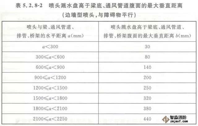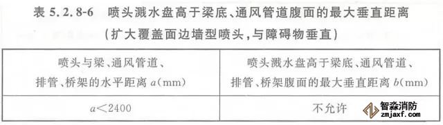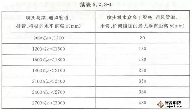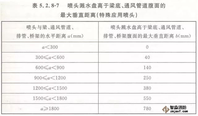 5.2.8 當(dāng)噴頭濺水盤高于附近梁底或高于寬度小于1.2m的通風(fēng)管道、排管、橋架腹面時(shí),噴頭濺水盤高于梁底、通風(fēng)管道、排管、橋架腹面的最大垂直距離應(yīng)符合表5.2.8-1~表5.2.8-9的規(guī)定(見圖5.2.8)。