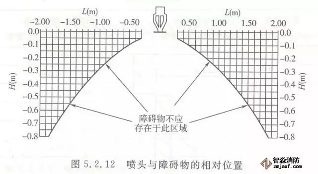 5.2.12 頂板處的障礙物與任何噴頭的相對(duì)位置,應(yīng)使噴頭到障礙物底部的垂直距離(H)以及到障礙物邊緣的水平距離(L)滿足圖5.2.12所示的要求。當(dāng)無(wú)法滿足要求時(shí),應(yīng)滿足下列要求之一。