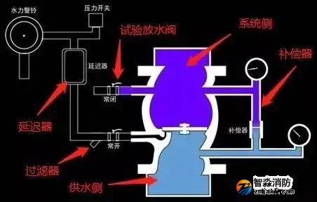 1、濕式報(bào)警閥結(jié)構(gòu)中名稱如圖所示,相對來說比較簡單。其中延遲器和補(bǔ)償器都是防止管網(wǎng)內(nèi)水流波動(dòng)導(dǎo)致閥組誤開啟的措施。試驗(yàn)放水閥可以在閥組上開啟后,達(dá)到只開啟閥組而不用運(yùn)轉(zhuǎn)整個(gè)系統(tǒng)來測試閥組的功能的作用。閥瓣伺應(yīng)狀態(tài)下封閉住報(bào)警管路,當(dāng)閥瓣開啟后,水流流入報(bào)警管路,充滿延遲器,觸動(dòng)壓力開關(guān)、水力警鈴報(bào)警。