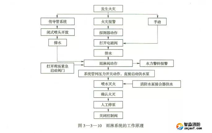 組成:火災(zāi)探測傳動控制系統(tǒng)、自動控制成組作用閥門系統(tǒng)、帶開式噴頭的自動噴水滅火系統(tǒng)。