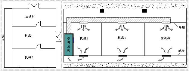 如下圖所示,若三個房間從吊頂?shù)降匕宥疾捎锚毩⒌目照{(diào)系統(tǒng),那么將機房1和機房2劃作一個區(qū)域或劃為兩個單獨滅火區(qū)都是可行的。但如果采用一臺精密空調(diào)為三個房間服務(wù)且為“上送風(fēng),地板下回風(fēng)”方式這三個房間就必須劃分成一個滅火區(qū)域,藥劑儲備應(yīng)該是上者的3倍或1.5倍,對工程的投資影響是比較大的。除過滅火劑和噴放管道布置要作為一個保護區(qū)考慮外,探測范圍也應(yīng)該分塊進行探測但還是一個探測區(qū)域,警報區(qū)域也應(yīng)該按照一個區(qū)域來設(shè)置和聯(lián)動。