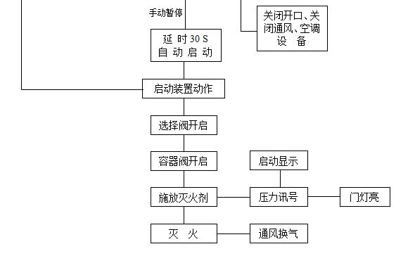 發(fā)生火災(zāi)時,當(dāng)一路探測器報警后,設(shè)在該防護區(qū)域內(nèi)的警鈴動作;兩路探測器都報警后,設(shè)在該防護區(qū)域內(nèi)外的蜂鳴器及閃燈動作;系統(tǒng)進入延時階段,控制盤完成相關(guān)設(shè)備的聯(lián)動控制。經(jīng)過延時后,控制盤輸出24V直流信號電源啟動儲氣瓶組上的電磁閥,打開儲氣瓶組釋放滅火劑氣體,滅火劑沿噴射短管和噴頭輸送到防護區(qū)域滅火。如值班人員先于火災(zāi)探測系統(tǒng)發(fā)現(xiàn)火情,當(dāng)用手提式滅火器或其它移動式滅火設(shè)備無法撲滅火災(zāi)時,可直接手動啟動來滅火。如發(fā)現(xiàn)是系統(tǒng)誤動作,或確有火災(zāi)發(fā)生但僅使用手提式滅火器和其它移動式滅火設(shè)備即可撲滅火災(zāi),可按下設(shè)在防護區(qū)域門外的緊急止噴按鈕,可以使系統(tǒng)暫時停止釋放藥劑。如需繼續(xù)開啟氣體滅火系統(tǒng),則只需松開緊急停止開關(guān)即可。