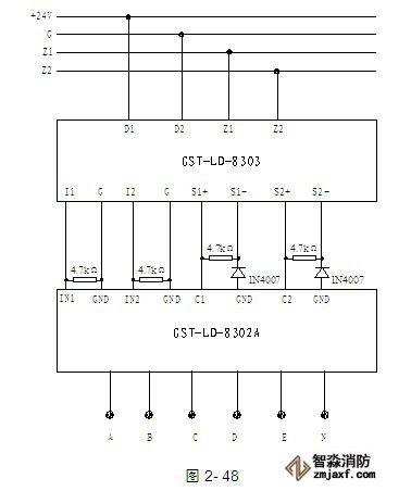 b.GST-LD-8303型模塊與GST-LD-8302A型模塊組合連接的方法如圖2-48所示: