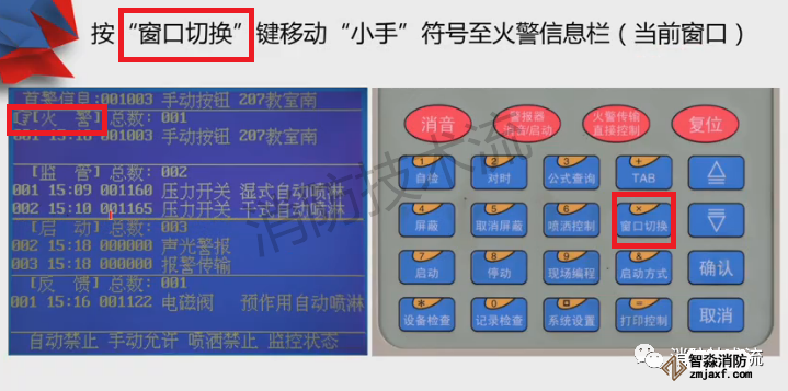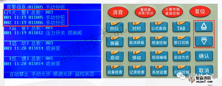 當(dāng)某個(gè)類型信息總數(shù)超過2條時(shí),可通過上下鍵翻動(dòng)查看,例如火警信息總數(shù)是3,可通過按下翻鍵查看第三條火警信息