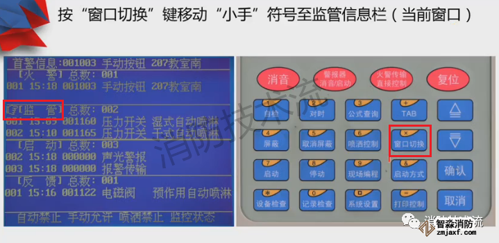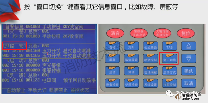 顯示屏分上、下半屏,上半屏為火警、監(jiān)管、故障、屏蔽等屬于報(bào)警信息,下半屏為啟動(dòng)、反饋、動(dòng)作等屬于聯(lián)動(dòng)信息