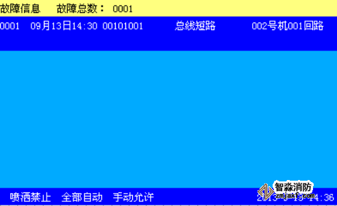 消防報警系統(tǒng)某個回路總線發(fā)生短路、線間電流過大時,控制器發(fā)出聲、光報警,同時在液晶屏上以中文顯示總線短路(見下圖),打印機、歷史記錄記錄相應(yīng)的故障信息。